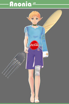 Anonia, a diminutive forest-dwelling elf, wields a humble fork as his trusty weapon, while a simple soda bottle cap serves as both his belt and shield.